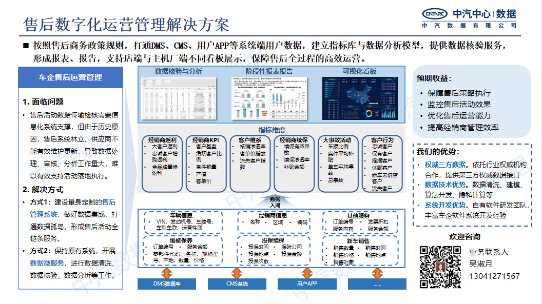 售后数字化运营管理的典型实践中,聚焦主机厂与经销商的售后业务,中汽数据依托自身数据和数据技术优势、软件研发能力,为售后业务运营提供数字化解决方案,能够灵活、高效、准确地实现关键指标分析、活动申请核验、数字化管理看板等,充分挖掘和释放数据价值,助力售后业务活动高效执行,帮助主机厂与经销商提升售后管理效率与售后服务产值。