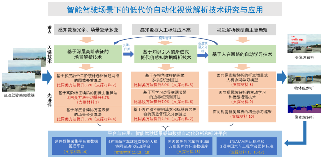为了突破现有自动驾驶场景视觉解析框架的技术瓶颈,必须摆脱其对海量精确标注数据的依赖,并实现模型的自主学习能力。项目团队开辟了智能驾驶场景下的低代价自动化视觉解析技术框架,发明了基于深层高阶表征的场景解析技术,实现了精确、鲁棒的驾驶场景感知数据去重和场景划分。提出了基于先验知识的渐进式低代价驾驶场景感知数据解析技术,克服了高精度视觉解析模型依赖海量精确标注数据的技术瓶颈。发明了人在回路的学习范式和感知模型增量学习框架,解决了视觉解析模型缺少自主适应能力和泛化性不强的难题。相关技术孵化了一套面向自动化驾驶场景感知数据标注的工具链和平台体系,为自动驾驶领域提供数据“采集-分析-标准”一体化服务。