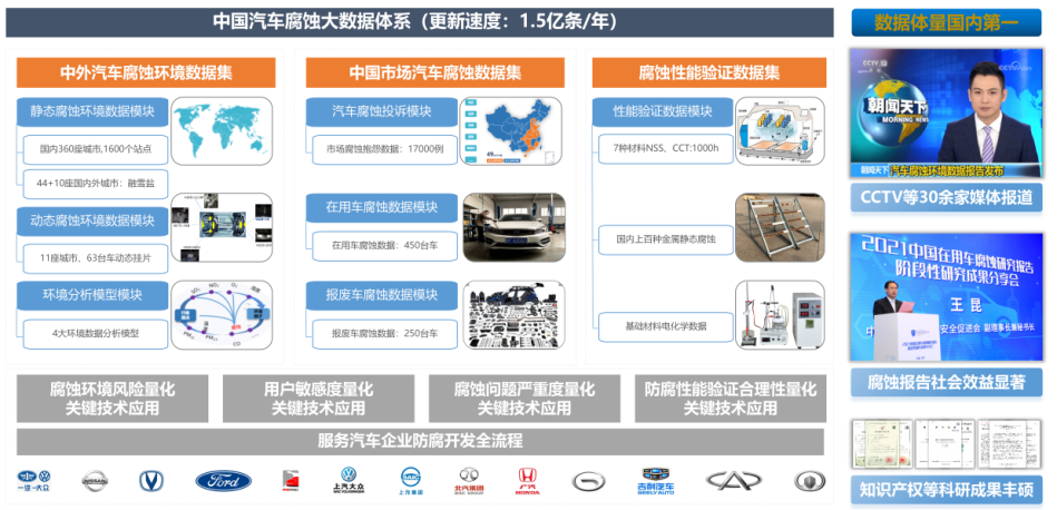 本项目是首次对汽车防腐本土化开发所需的数据体系进行的系统研究,符合我国关键支柱性产业核心技术自主化战略。项目形成多项高水平科研成果,总体达到了国际领先水平。已在重庆长安汽车股份有限公司、广州汽车集团股份有限公司、吉利汽车研究院有限公司等20余家企业推广应用,2021年上述企业乘用车产销量占全国70%以上,覆盖整车、零部件、材料企业及第三方服务机构等全汽车产业链,合计直接经济效益将近1.32亿元。中央电视台新闻频道等30余家媒体对该成果进行了报道。