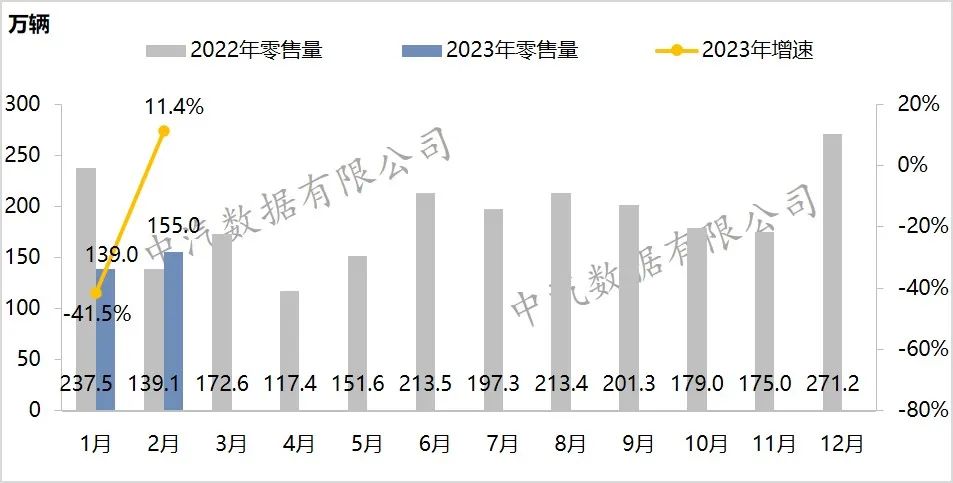 2月,汽车市场零售126.8万辆,环比增长11.5%,同比增长11.4%。1-2月,累计零售294.0万辆,累计下滑21.9%。