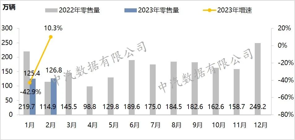 2月,乘用车零售126.8万辆,环比增长1.1%,同比增长10.3%。1-2月,累计零售252.1万辆,累计下滑24.6%。