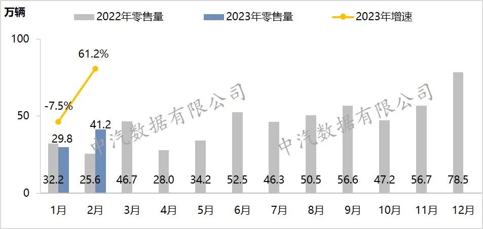2月,新能源汽车零售41.2万辆,环比增长38.3%,同比增长61.2%。1-2月,累计零售71.0万辆,累计增长22.9%,累计渗透率24.2%,较同期提升8.8个百分点。