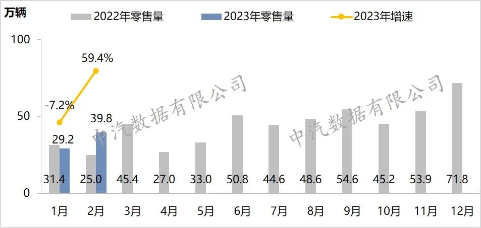 2月,新能源乘用车零售39.8万辆,环比增长36.5%,同比增长59.4%。1-2月,累计零售69.0万辆,累计增长22.3%,累计渗透率27.3%,较同期提升10.5个百分点。