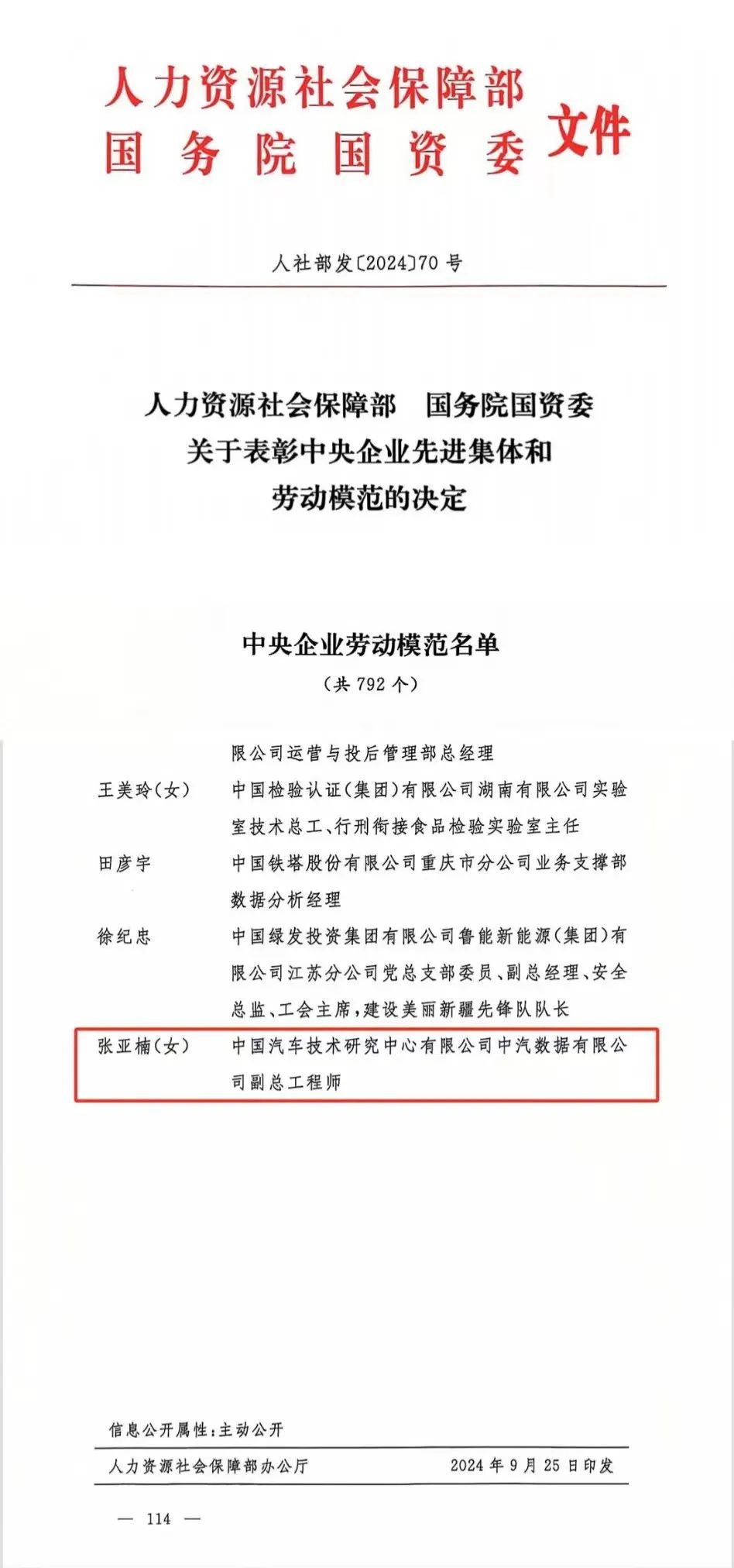 在中华人民共和国成立75周年之际,2024年9月26日,国务院国资委、人力资源社会保障部共同召开中央企业先进集体和劳动模范表彰大会。中汽数据副总工程师张亚楠被授予“中央企业劳动模范”称号。