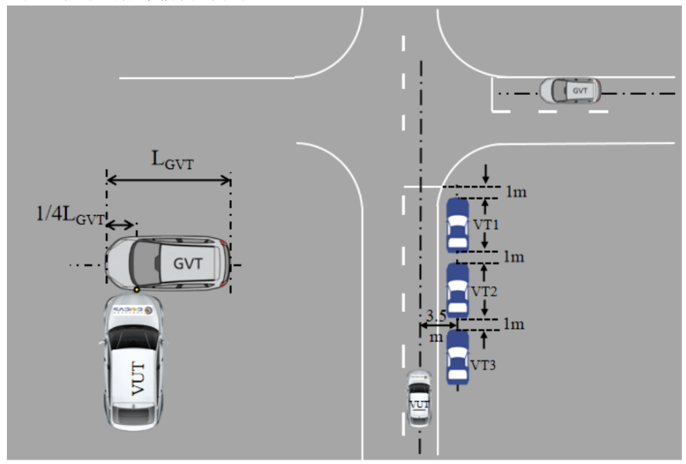 C2C SCPO(Car-to-Car Straight Crossing Path with Obstruction)在障碍物遮挡情形下,VUT 在交叉路口直行与垂直角度路径穿行的目标车辆发生碰撞冲突的场景。C2C SCPO 测试场景下,VT1、VT2、VT3 为 3 辆静止车辆,是普通大批量生产的汽车,轴距应满足 2.3m~2.9m 的范围。GVT 可具备 C-V2X 网联通信能力,VT1、VT2、VT3 不做要求。VUT 以所在车道的中心线为轨迹行驶,GVT 沿垂直于 VUT 方向移动且以车道中心线为行驶轨迹,VUT 分别以 50km/h 和 60km/h 的匀速行驶开展测试,GVT 分别以 40km/h 和 50km/h 的速度进行测试。