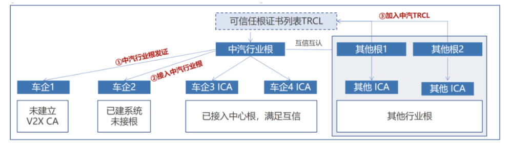 未建立V2X CA系统、自建系统未接根、已接入中汽行业根、已接入其他行业根。