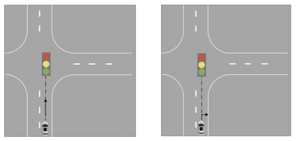 TSR场景为可选审核项。此场景下,道路交通信号灯始终置为红色,VUT 按照规划行驶路径沿车道中心线行驶,分别在直行道以40km/h,50km/h和60km/h,右转道以20km/h 的速度测试 TSR 功能,VUT右转时需开启右转向灯,转向灯开启时刻不晚于转向开始时刻前 2s。