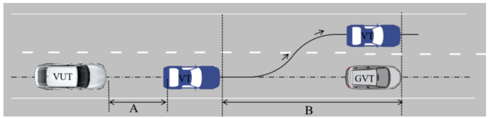CCRH场景为必测项。此场景下,目标车辆(GVT)、前方遮挡车辆(VT)和被测车辆(VUT)在同一车道,VUT 与 VT 以相同的速度保持固定的相对距离沿车道中间匀速行驶,在距离为A时,达到稳定车速,测试车速分别为80km/h、120km/h,对应两者之间的距离A分别为50m、100m。当VT和GVT车头的距离B分别达到49m,73m时VT切出至相邻车道,VT车头位置与 GVT车头位置平行,切出过程持续时间为 2.2s。